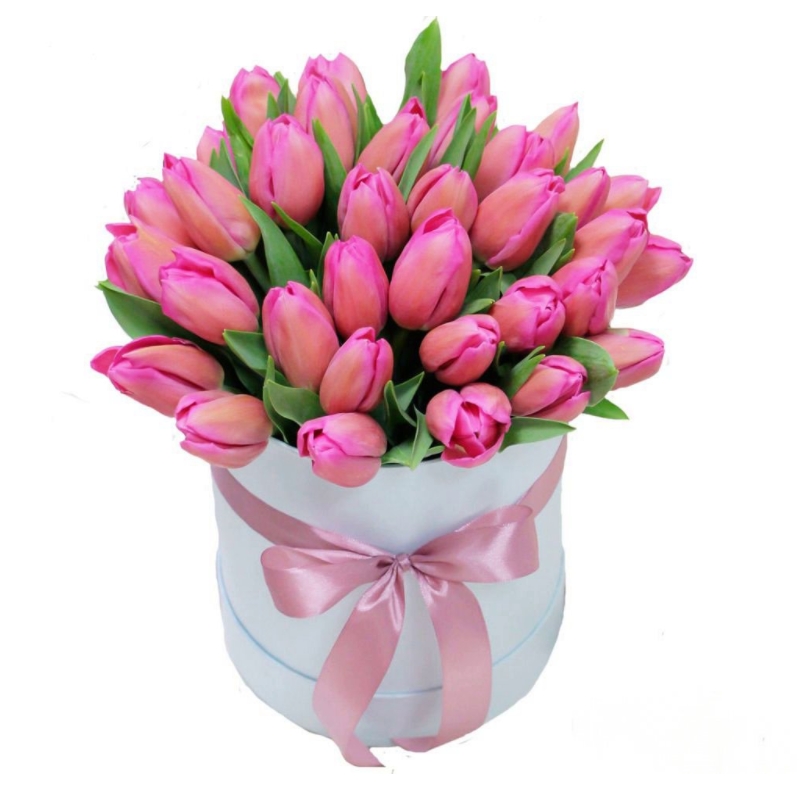 51 розовый тюльпан, коробка, розовая лента.