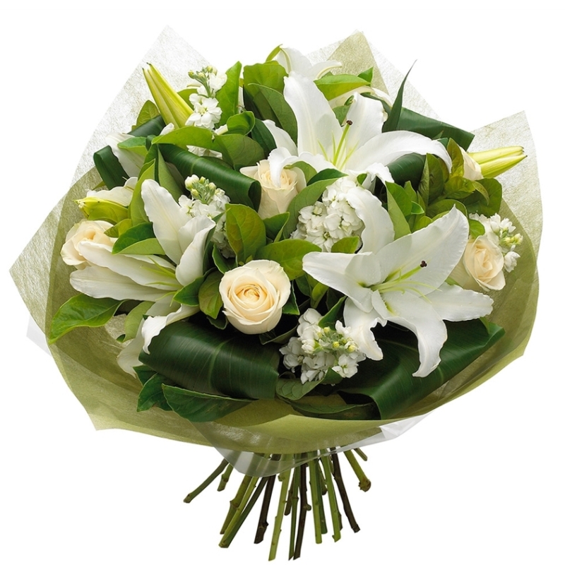 Букет состоит из 3 лилии, 5 роз, 5 белых маттиол, аспидистра, рускус, красивая упаковка, атласная лента.