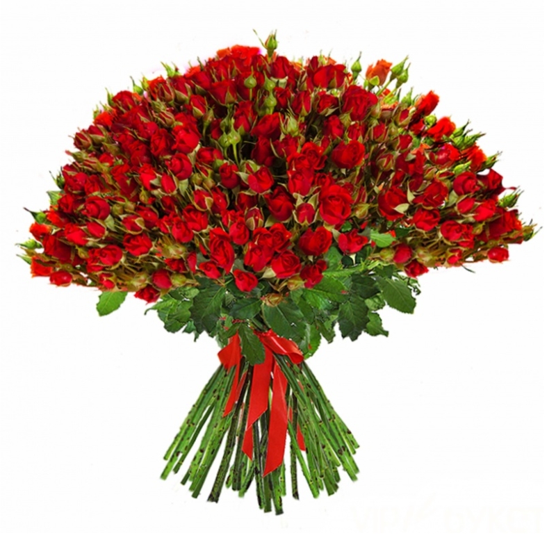 Букет состоит из 101 красная кустовая роза, прозрачная упаковка, атласная лента.