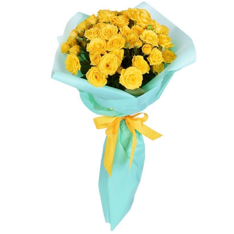 Букет состоит из 15 желтых кустовых роз, красивая упаковка, атласная лента.