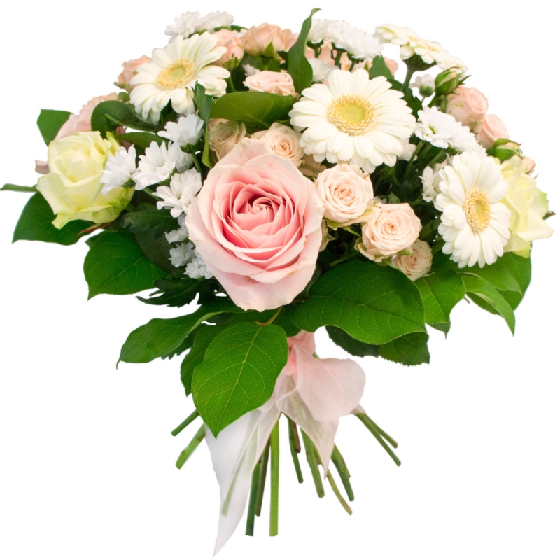 Букет состоит из 3 белые розы, 3 розовые розы, 4 кремовых кустовых роз, 4 кустовых ромашковых хризантем, 5 белых гербер, зелень, прозрачная упаковка, атласная лента.
